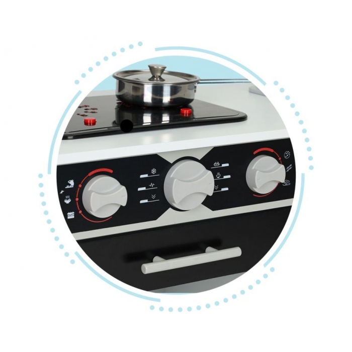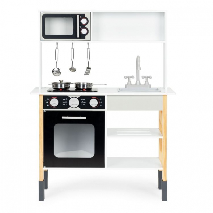 Bucataria din lemn pentru copii este realizata din lemn, ceea ce ii asigura stabilitatea si durabilitatea. In bucatarie veti gasi tot ce aveti nevoie pentru a va juca: un cuptor incorporat, plita cu inductie, cuptor cu microunde, chiuveta cu robinet mobil, butoane rotative etc. – bucataria fiind dotata cu lumini si efecte sonore.