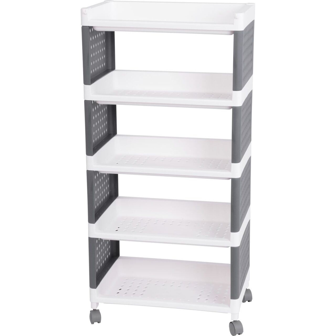 Comoda/raft plastic, MagicHome, pe roti, 5 polite, gri si alb, max 25 kg, 49x29x97 cm