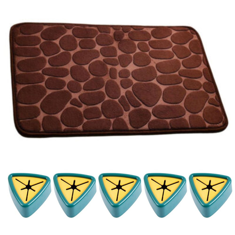 Covoras de baie cu spuma de memorie, Anti-Derapant, Ultra-Absorbant, 60 x 40 cm, Maro si 5 Suporti Impermeabili Autoadezivi cu Sistem Push Free pentru Prosoape, 5 x 2.3 cm, Verde