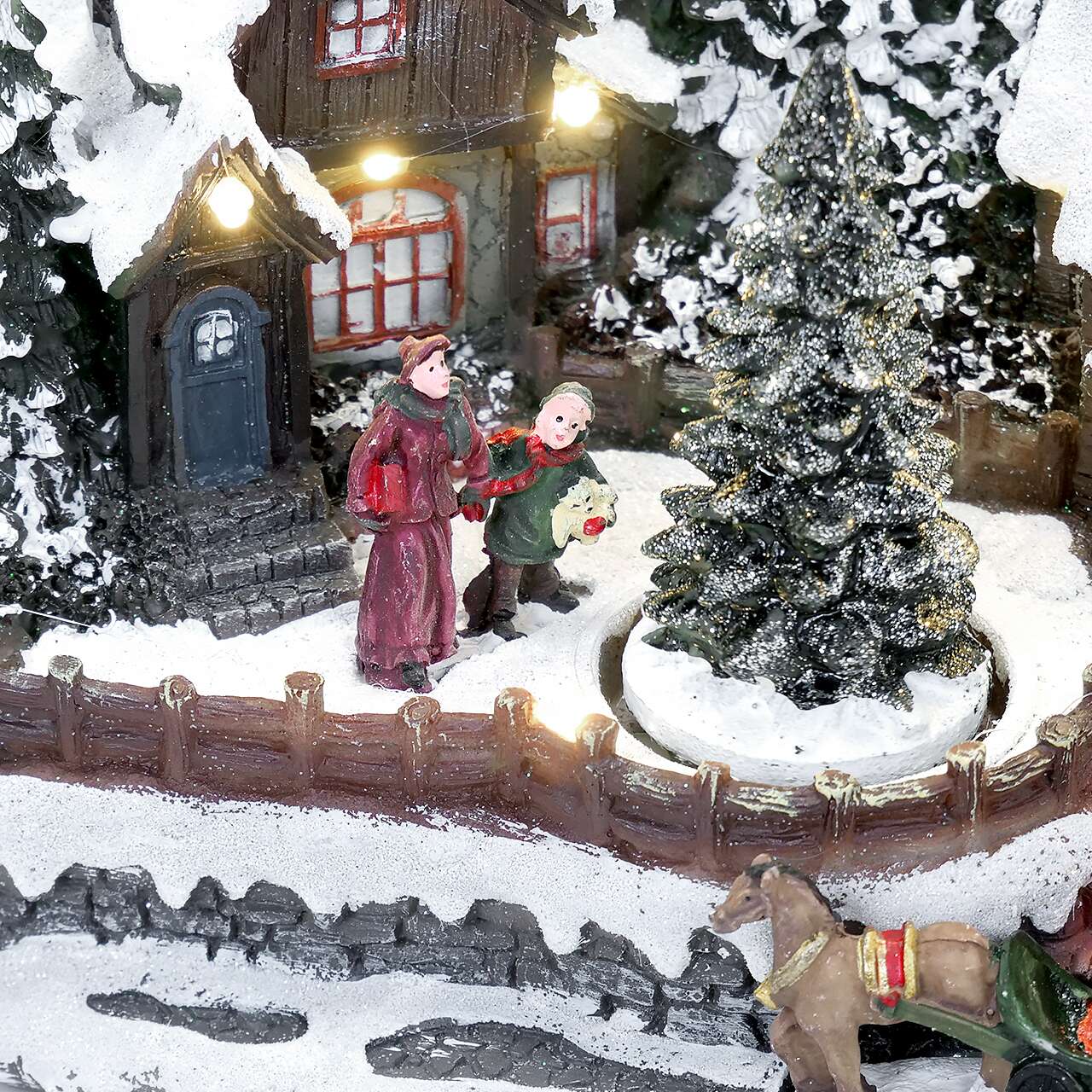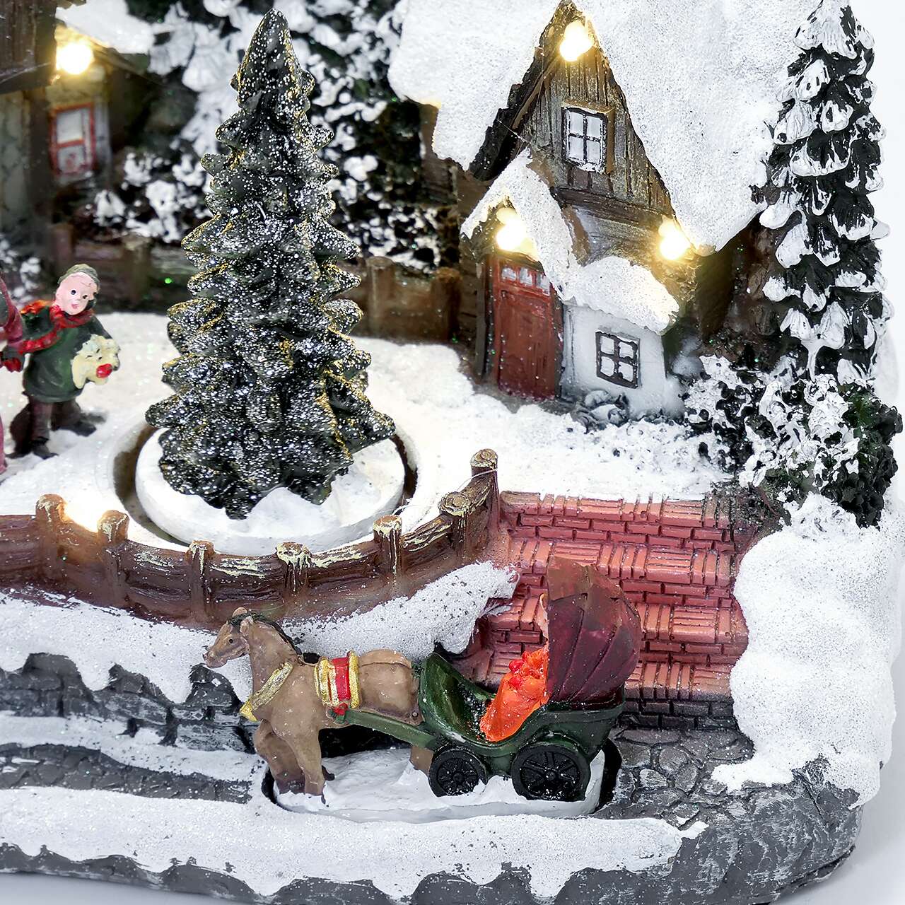 Decoratiune Craciun, polirasina, Sat de Craciun, cu brazi si caleasca, LED, 3xAA, 22x16x15 cm, Magic Home