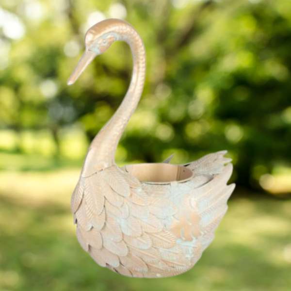 Descopera Decoratiunea Mercaton pentru Gradina, un model elegant de gasca aurie cu ghiveci pentru flori, realizata din metal, perfecta pentru a adauga un plus de farmec si functionalitate gradinii tale.