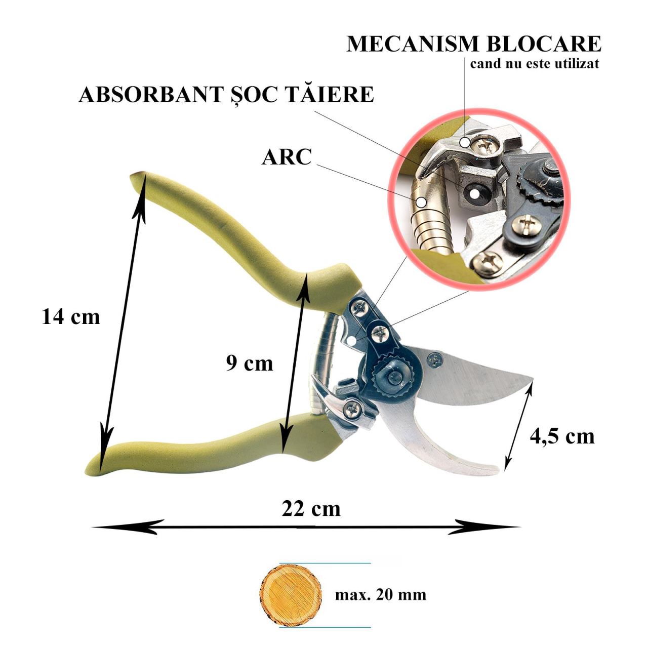 • Mecanism de blocare USOR de deschis – blocaj de siguranta pentru a tine lamele in pozitia inchis atunci cand nu este utilizata foarfeca.