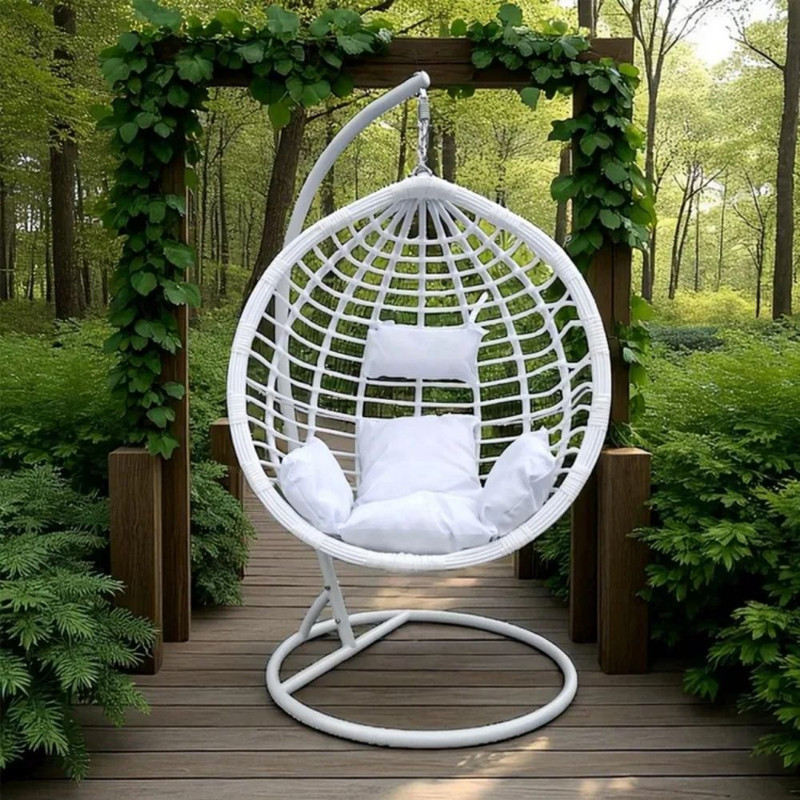 Leaganul tip cocoon in culoare alb se potriveste usor cu mobilierul existent si completeaza armonios orice spatiu de relaxare.