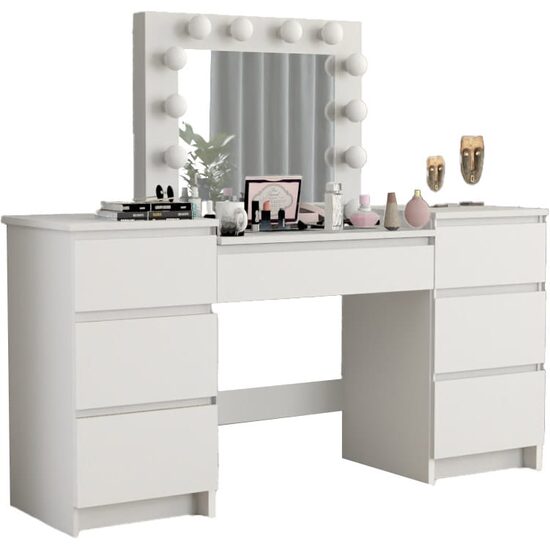 • Este o piesa de mobilier eleganta si practica, proiectata pentru a satisface nevoile si preferintele persoanelor care cauta un spatiu dedicat pentru a-si ingriji frumusetea si a-si stoca cosmeticele si bijuteriile. Aceasta masa este prevazuta cu o oglinda mare si 12 lumini LED incorporate, ceea ce o face ideala pentru aplicarea machiajului sau coafurii.