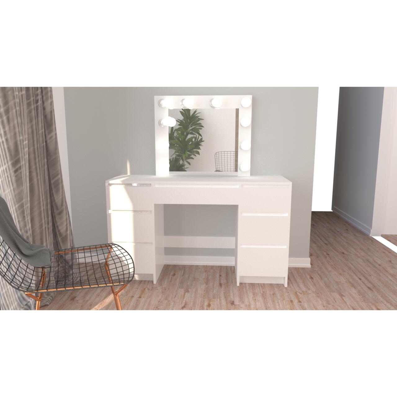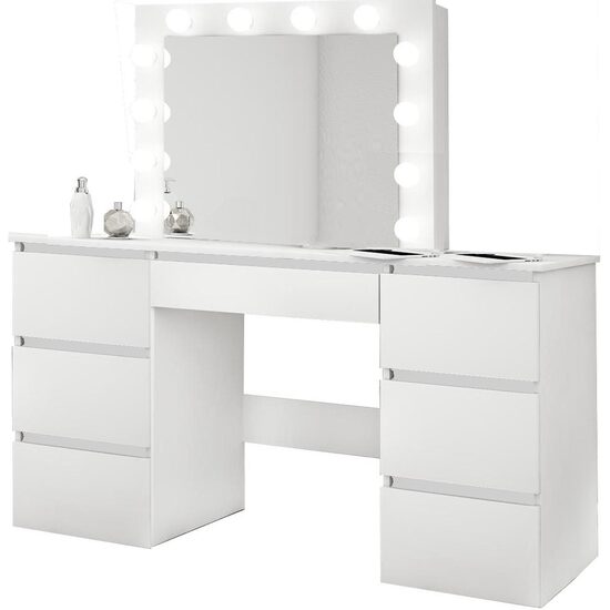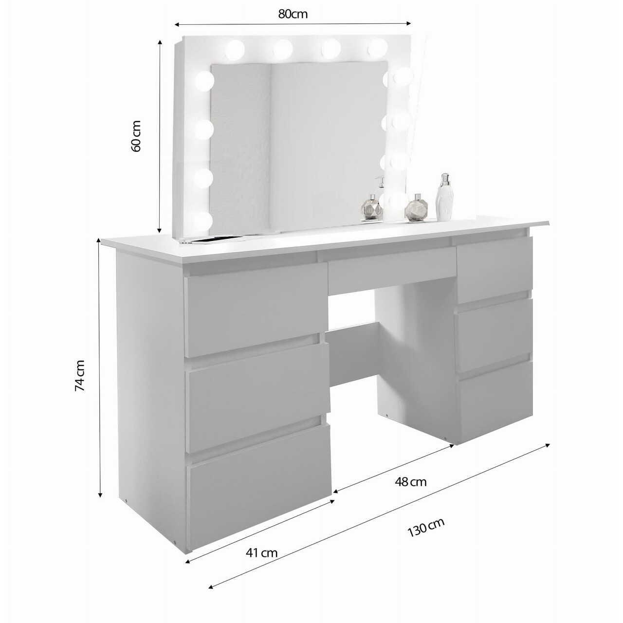 • Este o piesa de mobilier eleganta si practica, proiectata pentru a satisface nevoile si preferintele persoanelor care cauta un spatiu dedicat pentru a-si ingriji frumusetea si a-si stoca cosmeticele si bijuteriile. Aceasta masa este prevazuta cu o oglinda mare si 12 lumini LED incorporate, ceea ce o face ideala pentru aplicarea machiajului sau coafurii.