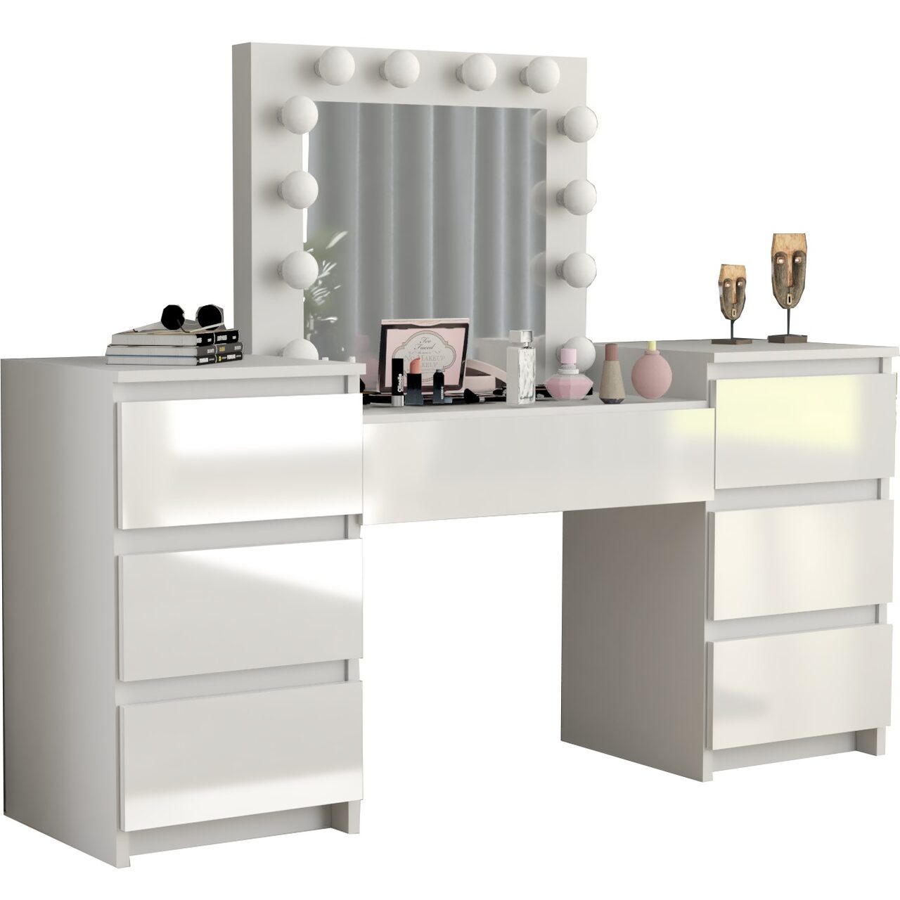 Masa de toaleta/machiaj, alba, sertare lucioase, cu oglinda si LED-uri, Silvia, 155x42x135 cm