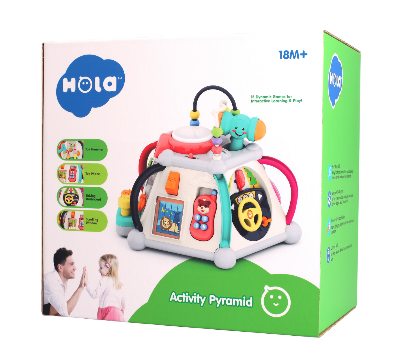 Copilul dumneavoastra poate sa se joace si sa invete alaturi de piramida cu activitati de la HolaToys. Acesta va oferi copilului dumneavoastra momente pline de distractie si veselie, iar dumneavoastra, privindu-l, zambete nemasurabile. Fiecare din fetele jucariei contin activitati diferite. Sunetele si luminile emise sunt menite sa dezvolte perceptia vizuala si auditiva si coordonarea dintre maini si ochi a copilului dumneavoastra. Formele speciale si culorile vii incurajeaza copilul sa exerseze si sa se joace stimuland astfel dezvoltarea individuala. Functioneaza cu 3 baterii AA de 1.5v care sunt incluse. Dimensiuni produs 31cm L x 29.5cm l x 22cm h. Recomandat de la varsta de 18 luni+.
