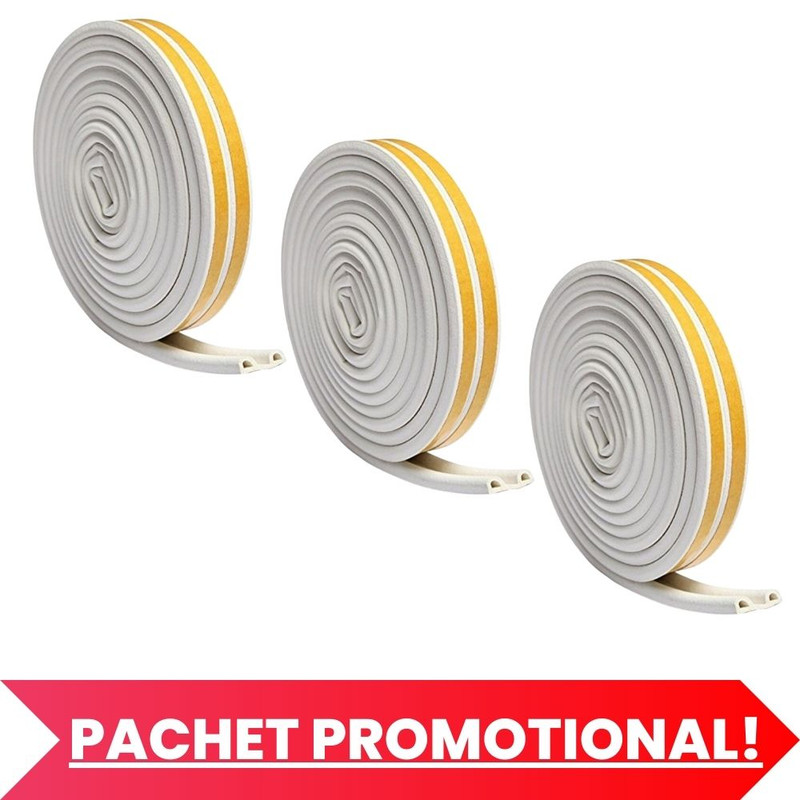 Set 3 buc, Banda autoadeziva pentru etansarea usilor si ferestrelor, Profil P, 9mm x 5.5mm, Rezistenta UV, Cauciuc EPDM, 6 m, AlbBanda autoadeziva pentru etansarea usilor si ferestrelor reprezinta solutia ideala pentru izolarea termica si etansarea eficienta a spatiilor interioare impotriva penei de vant, a zgomotului si a infiltrarilor de apa sau praf.Cu o grosime de 5.5 mm, latime de 9 mm si o rezistenta UV sporita, aceasta banda autoadeziva este confectionata din cauciuc EPDM de inalta calitate, asigurand un etansare eficienta si durabila.Caracteristici principale: – Material rezistent si durabil: Banda autoadeziva este realizata din cauciuc EPDM de inalta calitate, care este rezistent la intemperii, la radiatia UV si la variabilitatile de temperatura. – Grosime eficienta de 5.5 mm: Grosimea de 5.5 mm a benzii ofera un nivel optim de etansare, asigurand ca spatiul este izolat termic si protejat impotriva penei de vant, a zgomotului sau a altor agenti perturbatori. – Latime de 9 mm: Latimea benzii este ideala pentru etansarea eficienta a rosturilor usilor si ferestrelor, asigurand un contact sigur si uniform. – Rezistenta UV: Banda are o rezistenta sporita la radiatia UV, ceea ce o face potrivita pentru utilizare pe o perioada indelungata in conditii de expunere la soare. – Lungime generoasa de 6 metri: O lungime de 6 metri (3m x 2) ofera suficient material pentru a etansa mai multe usi sau ferestre, economisind timp si resurse. – Autoadeziva si usor de montat: Banda este prevazuta cu un strat autoadeziv puternic, ceea ce face montarea sa usoara si rapida, fara a necesita echipamente sau instrumente speciale.Banda autoadeziva pentru etansarea usilor si ferestrelor este o solutie eficienta si practica pentru a imbunatati izolarea termica si acustica a locuintei dvs.Cu rezistenta sa la intemperii si UV, aceasta banda va ajuta la mentinerea confortului in interior, la economisirea energiei si la protejarea impotriva factorilor externi.Specificatii / bucata: – Rezistent la intemperii (UV – si termo -rezistent) – Banda din cauciuc de calitate superioara – Autoadeziva – Usor de instalat – Profil: “P” – Latime: 9 mm – Grosime: 5.5 mm – Lungime:6 m (2 x 3 m) – Grosimea rostului etansat: 2 mm – Culoare: Alb – Material: Cauciuc -EPDM – Masa: 74 g – Rezistenta termica: -50°C – +60°C – Durata generala de viata: 8 ani